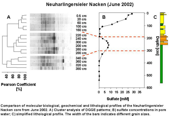 For molecular biological analysis of the microbial communities, the total nucleic acids (DNA) were extracted from the sediment layers in 20 cm depth intervals. The extracted genomic DNA served as a template for the polymerase chain reaction (PCR). Universal bacterial primers were used to specifically amplify a part of the 16S rRNA gene. Amplification products were analysed by denaturing gradient gel electrophoresis (DGGE) using a gradient of 50 to 70 % denaturant in order to detect and compare variations of the microbial community compositions. This technique produces band patterns in an electrophoresis gel. Each band represents one sequence type indicating one bacterial species. These band patterns visualise "fingerprints" of the investigated microbial communities. The similarity of DGGE patterns is displayed in a dendrogram calculated by Pearson correlation and UPGMA. It shows three clusters of community composition. The clusters correspond to the three lithologically different intervals in the core. The upper cluster of samples from 0 to 160 cm belong to the sand-dominated core section. The cluster of samples between 200 and 300 cm depth matches the shell-rich interval and the uppermost part of the mud layer. This corresponds to the interval in which sulfate concentrations in the pore water reach a second maximum at depth. The microbial community present in the deepest mud-rich section of the core (below 320 cm) formed the third cluster.