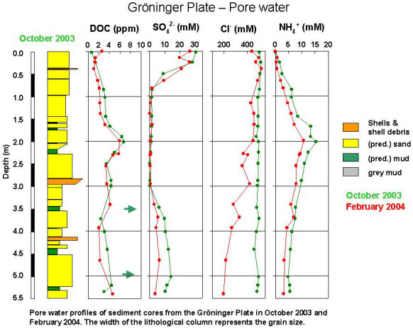 At Gröninger Plate the pore water DOC showed a gentle maximum between 1.5 and 2.5 m (ca. 7 mM) associated with the occurrence of mud-rich layers with elevated contents of organic matter in this interval. Sulfate decreased within the upper 90 cm from ca. 30 mM at the surface to almost zero and was absent down to 3 m depth. Underneath, a second sulfate maximum occurred with values up to 14 mM extending downward to more than 5.5 m depth. Like in the cores from Neuharlingersieler Nacken ammonium concentrations showed a maximum (15 mM) in the zone where sulfate was absent, and decreased downward to ca. 5 mM. At this location the chloride concentrations below 2 m depth differ strongly in the cores from October 2003 and February 2004. This suggests that pore water was mixed with water depleted in sulfate and chloride by lateral inflow. DOC values were apparently not affected.